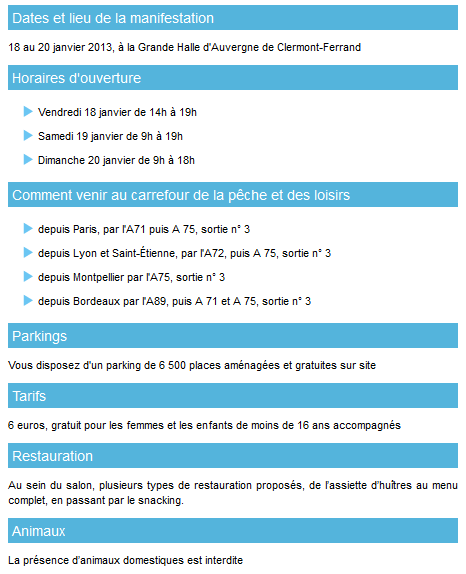 Pour sa 24ème éditions le salon ouvrira ses portes à Clermont Ferrant du 18 au 20 janvier 2013, c’est l’occasion d’en apprendre un peu plus sur la peche et ce qui l’entoure en rencontrant de nombreux acteurs de cette passion qui est la notre, comme par exemple les nombreuses fédérations ou encore les guides de peche ou associations halieutiques.